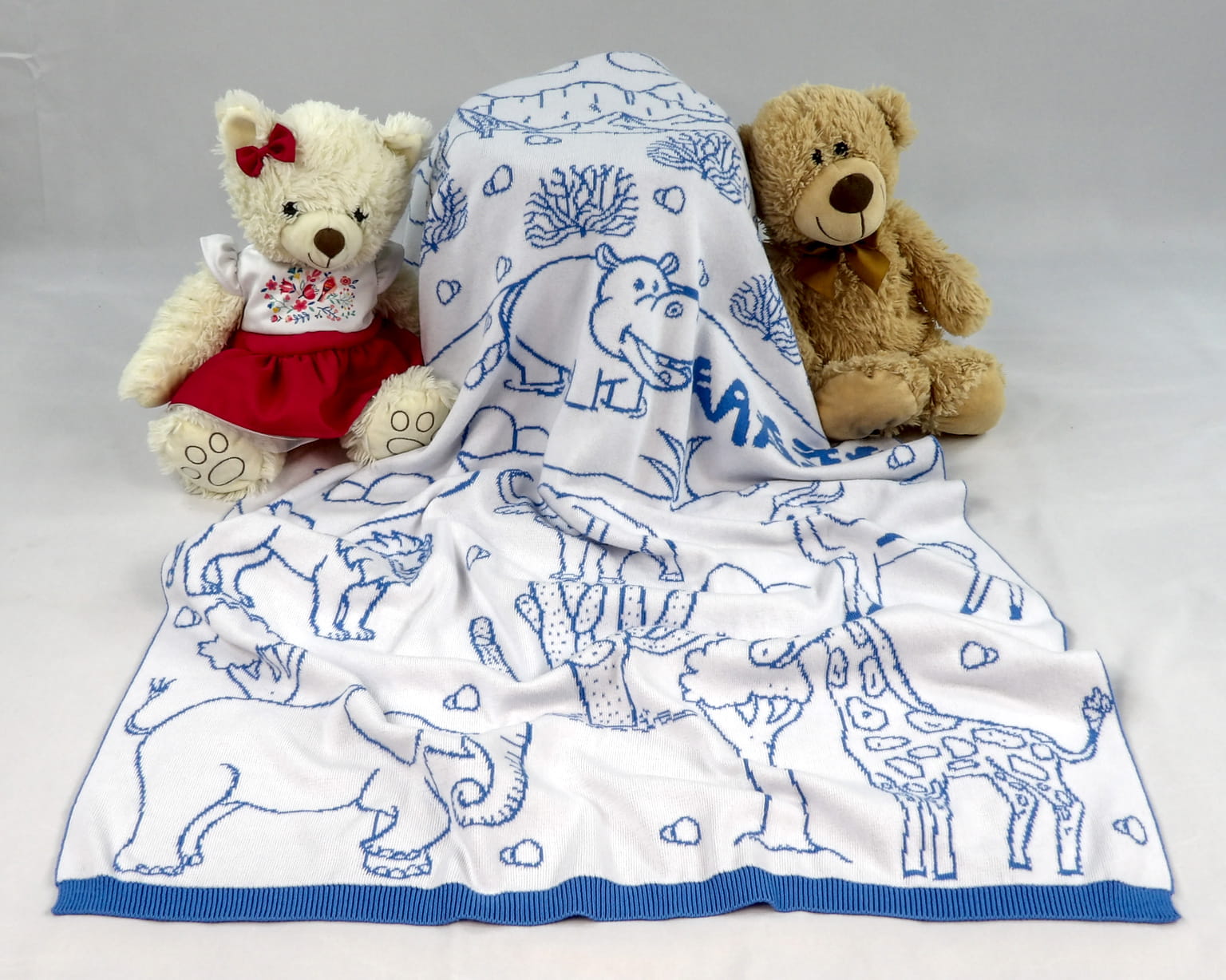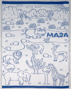 Na kocyku znajdują się urocze afrykańskie zwierzątka, z możliwością dodania personalizacji: imienia, daty urodzenia, wzrostu, wagi oraz dowolnej dedykacji.
