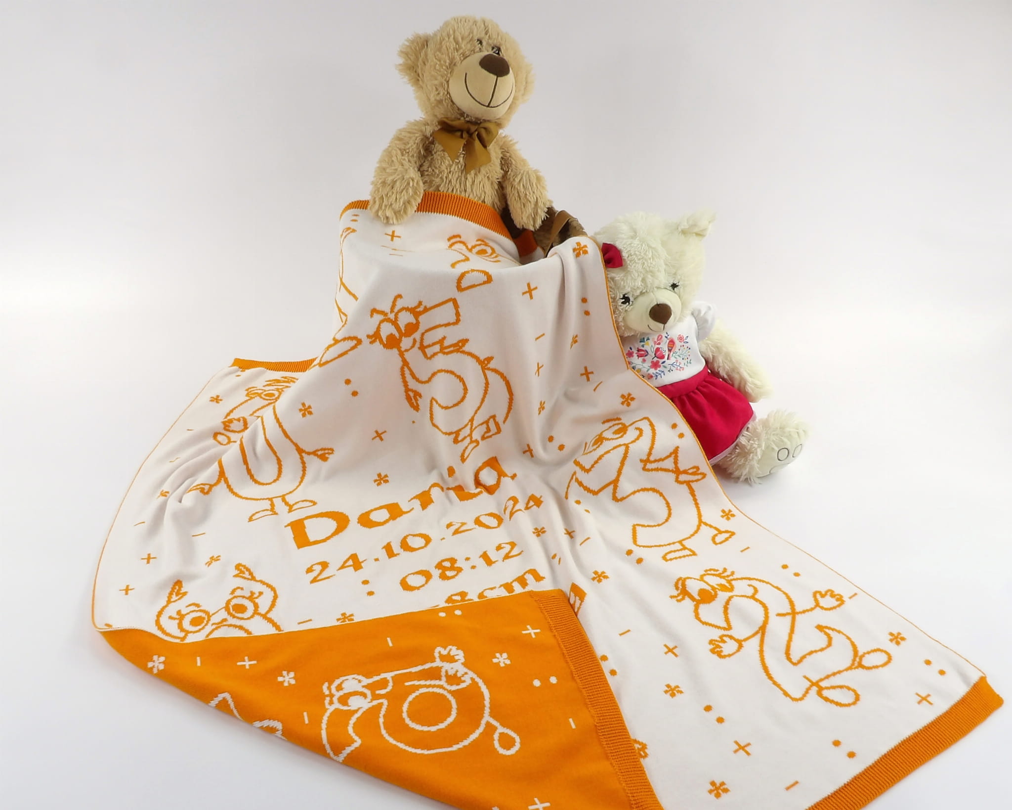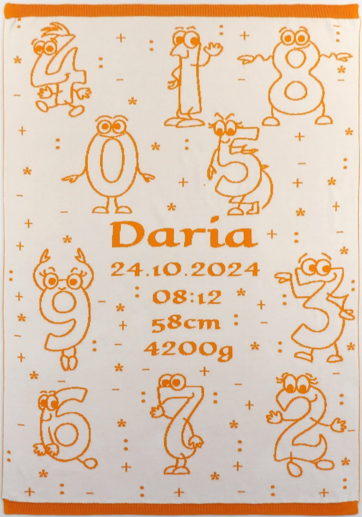 Koc Cyferki Personalizowany to wyjątkowy kocyk z miękkiej dzianiny żakardowej wykonany ze 100% naturalnej bawełny organicznej.