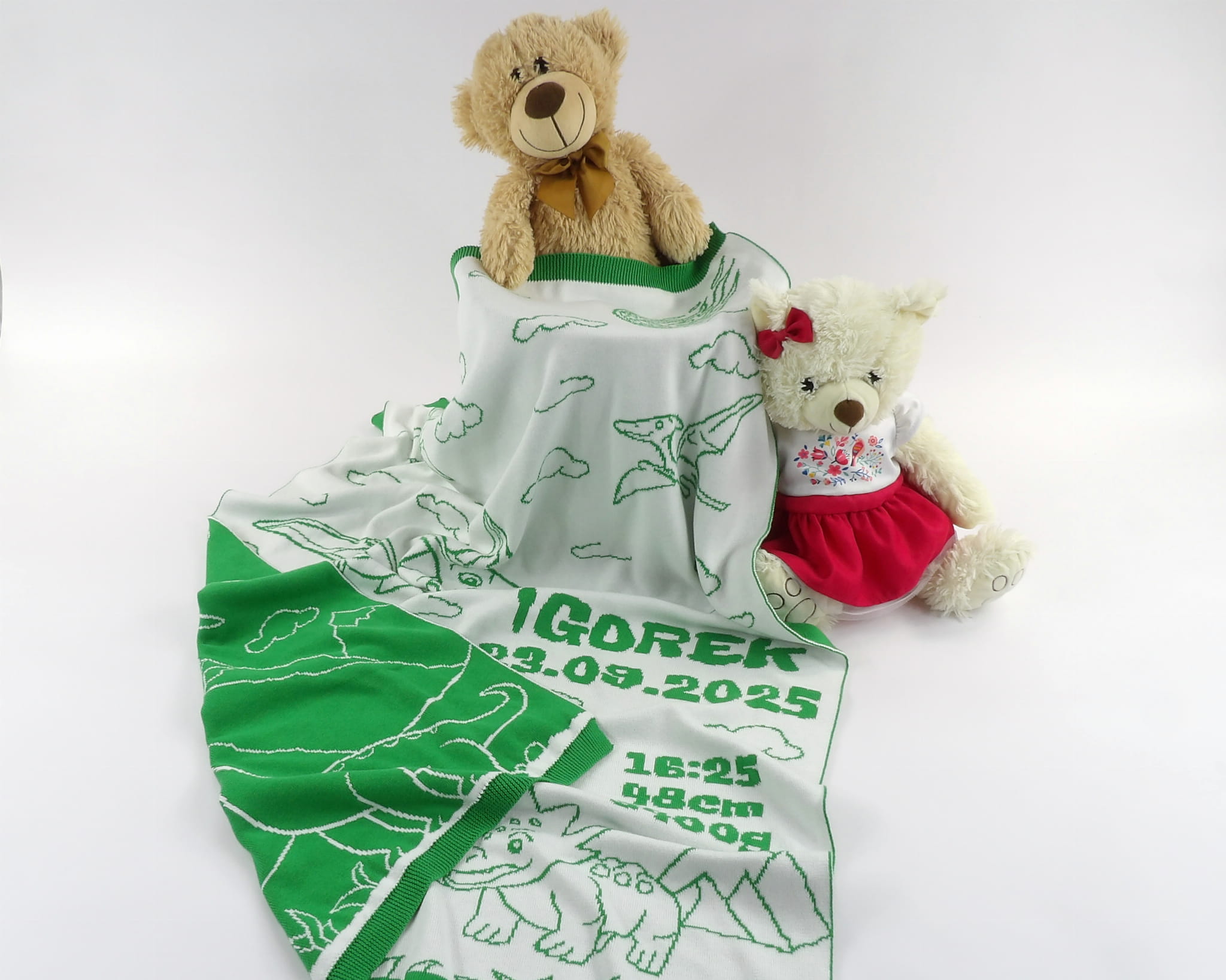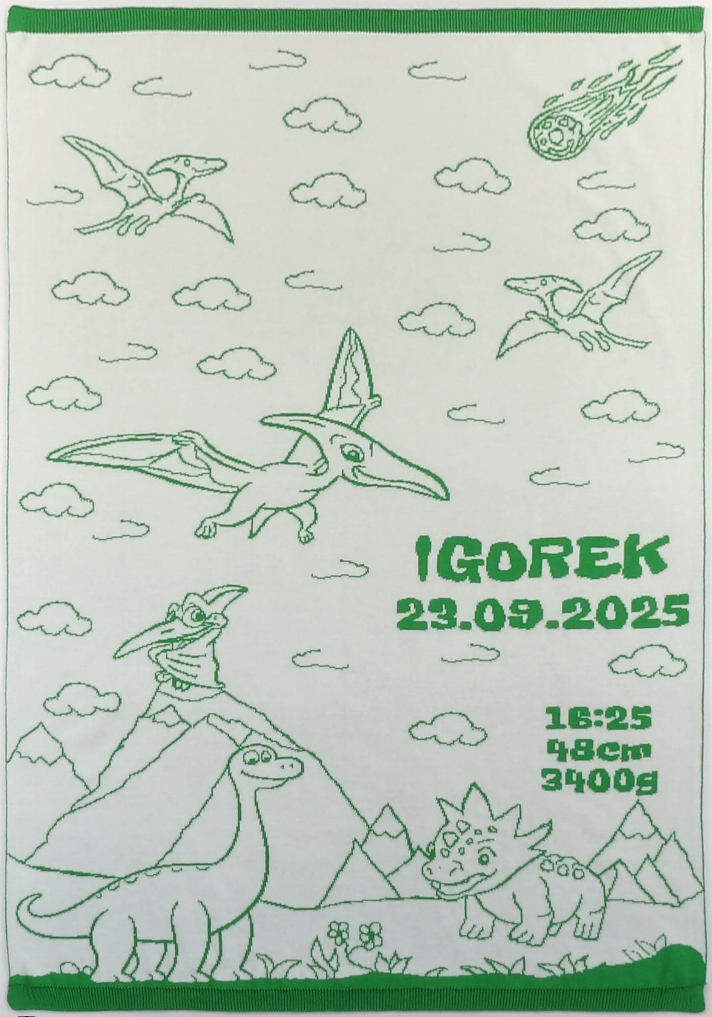 Personalizowany, żakardowy (nie jest to nadruk ani haft) Kocyk Dinozaury z 100% bawełny organicznej.