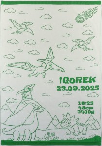 Kolorowy wzór z sympatycznymi dinozaurami pobudza wyobraźnię i dodaje radości codziennym chwilom, z możliwością dodania personalizacji: imienia, daty urodzenia, wzrostu, wagi oraz dowolnej dedykacji.