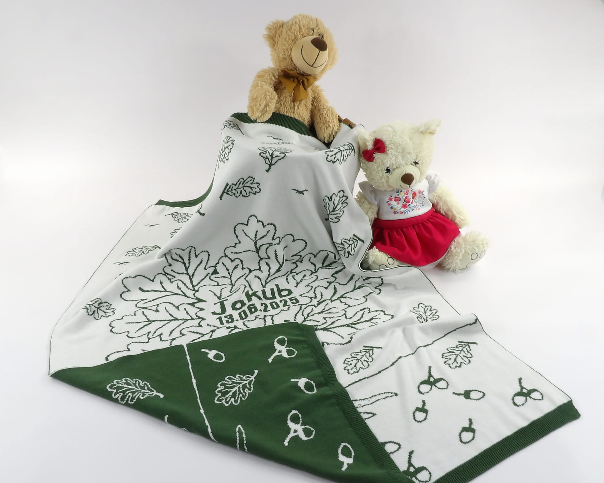 Koc Drzewo Personalizowany to wyjątkowy kocyk z miękkiej dzianiny żakardowej wykonany ze 100% naturalnej bawełny organicznej.
