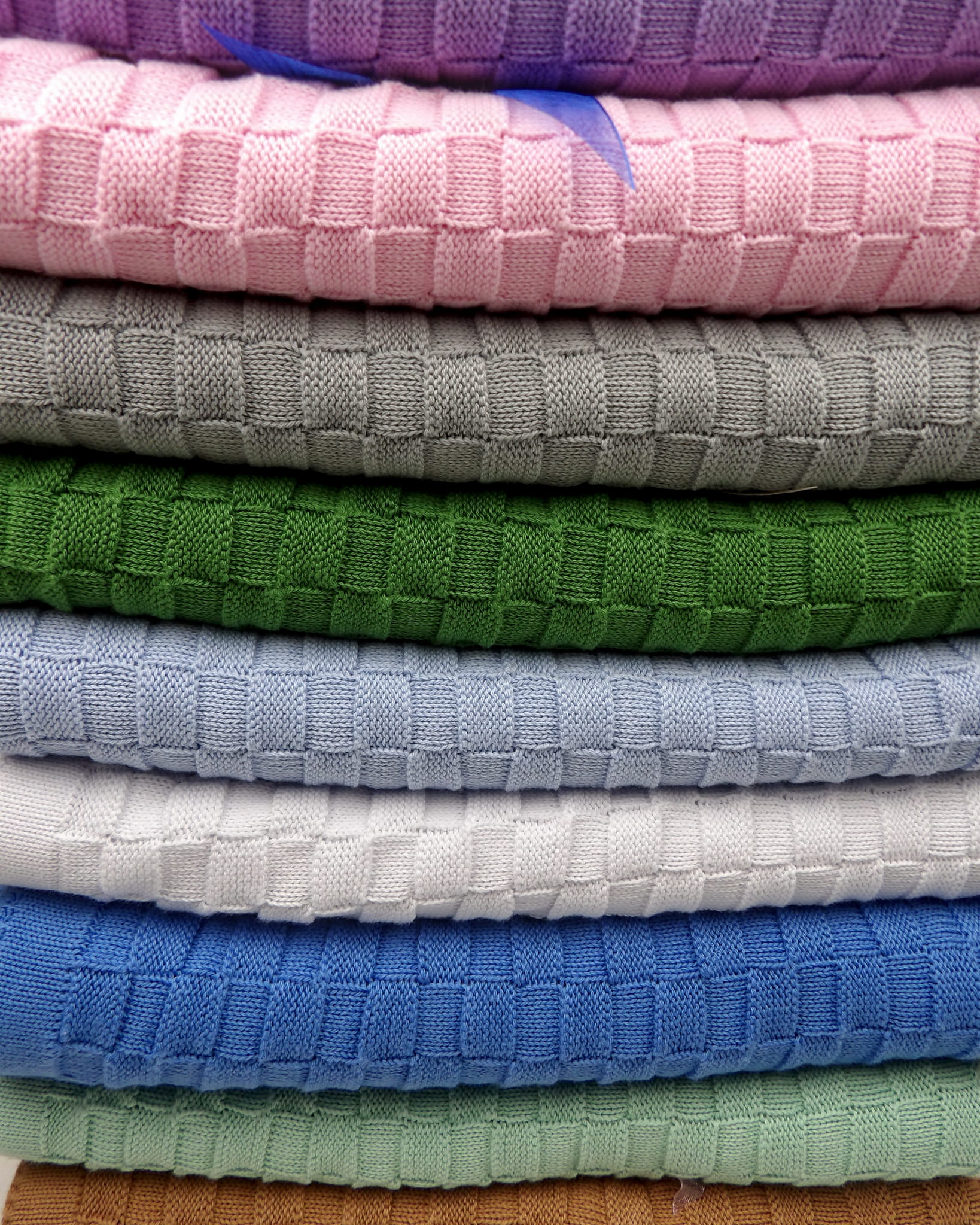 Dziergany wzorem szachownica, tworzy efektowną strukturę w postaci średniej wielkości kratek, które nadają mu wyjątkowy charakter i elegancję.