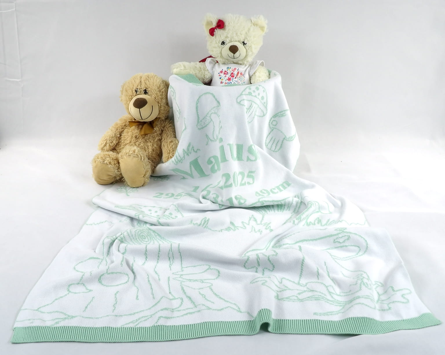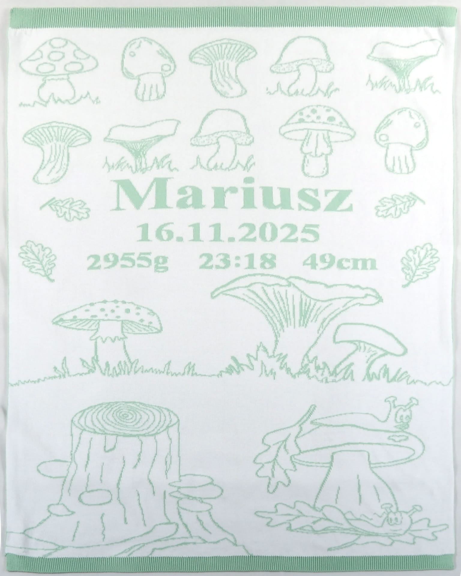Na kocyku znajdują się grzybki, z możliwością dodania personalizacji: imienia, daty urodzenia, wzrostu, wagi oraz dowolnej dedykacji.