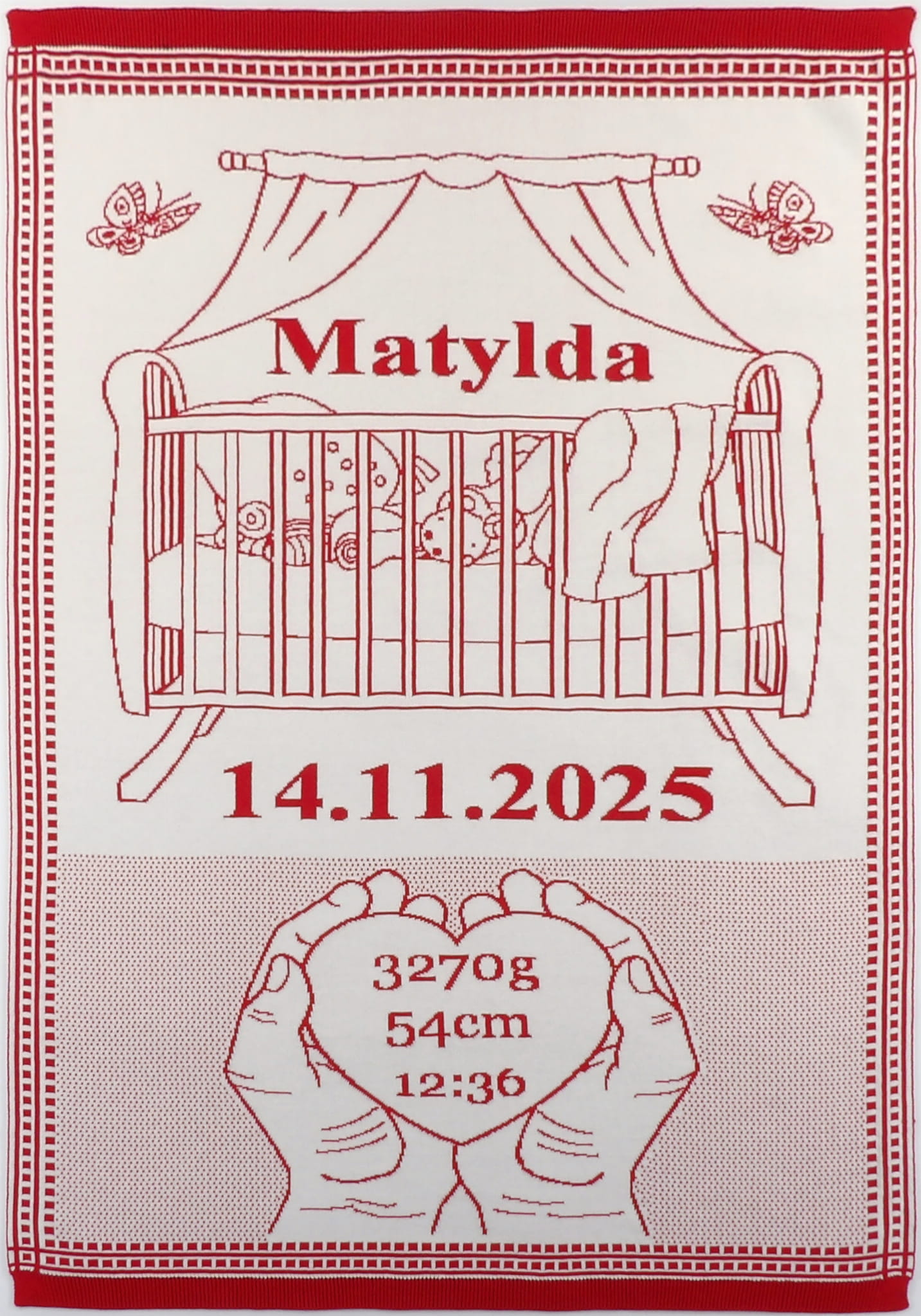 Personalizowany, żakardowy (nie jest to nadruk ani haft) Kocyk Kołyska z 100% bawełny organicznej.
