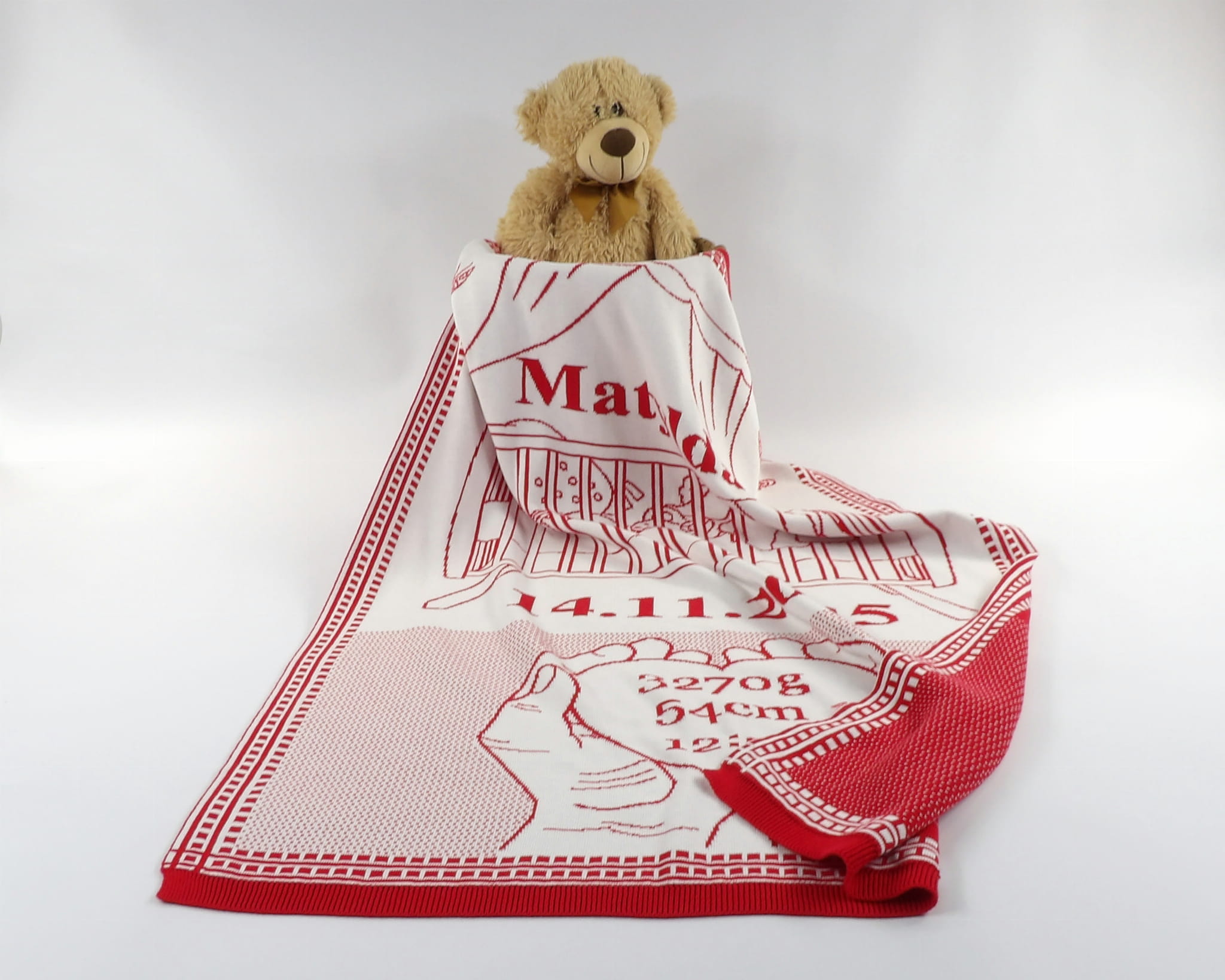 Każdy kocyk możesz spersonalizować, dodając imię dziecka, datę i godzinę urodzenia, wagę, wzrost oraz własną dedykację.