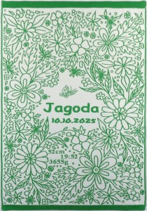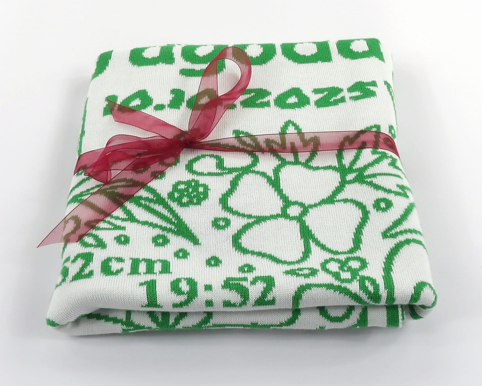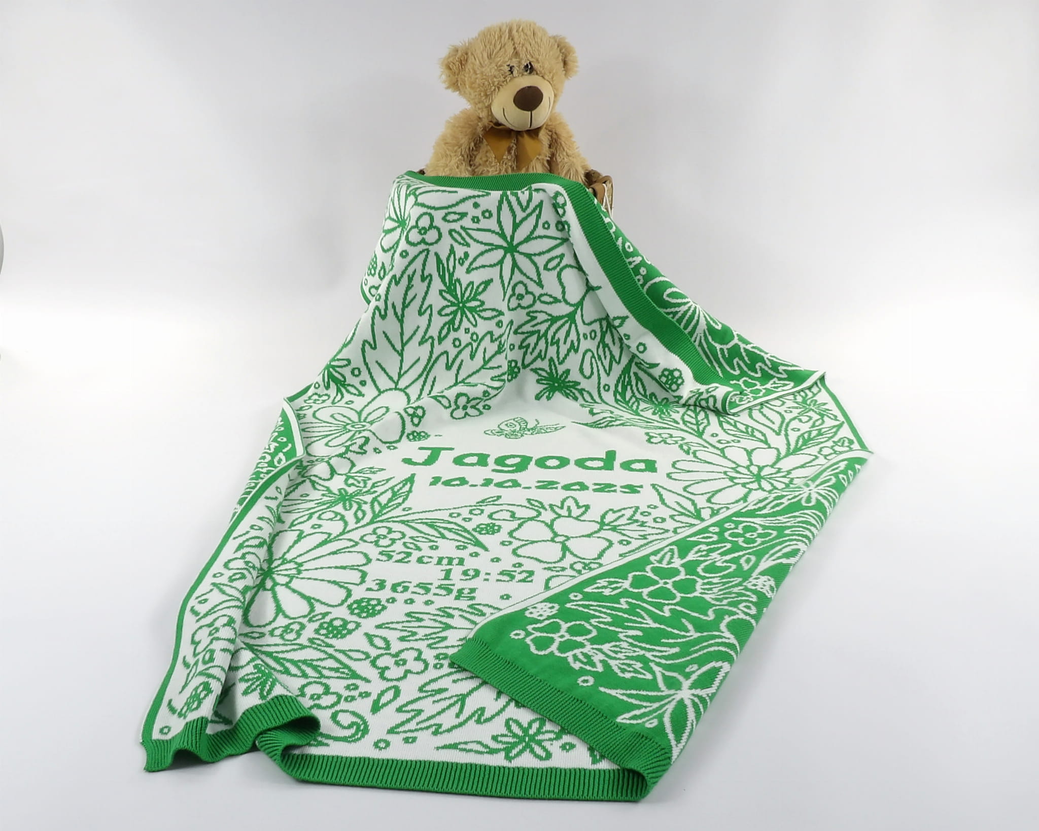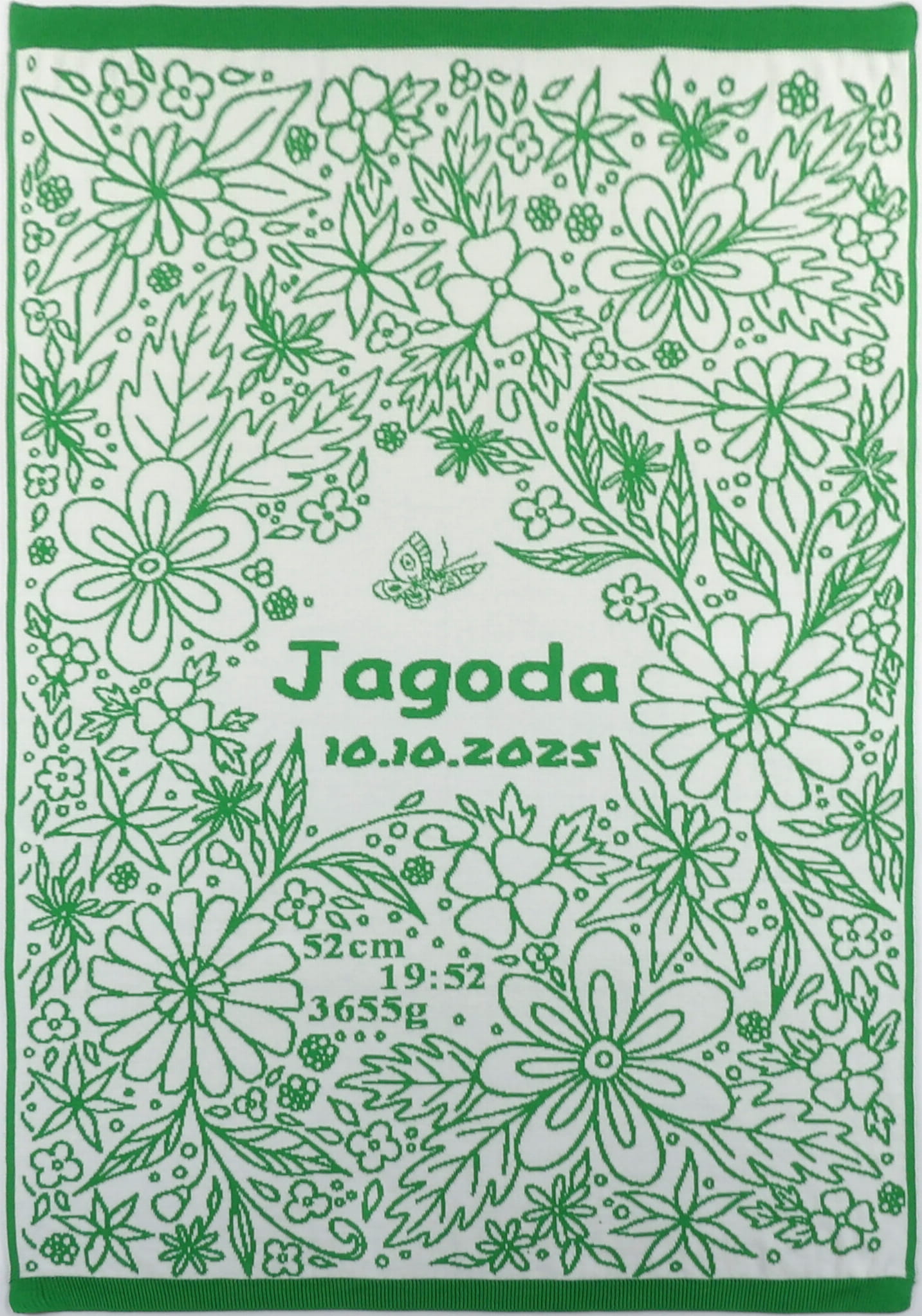 Koc Kwiaty Personalizowany to wyjątkowy kocyk z miękkiej dzianiny żakardowej wykonany ze 100% naturalnej bawełny organicznej.