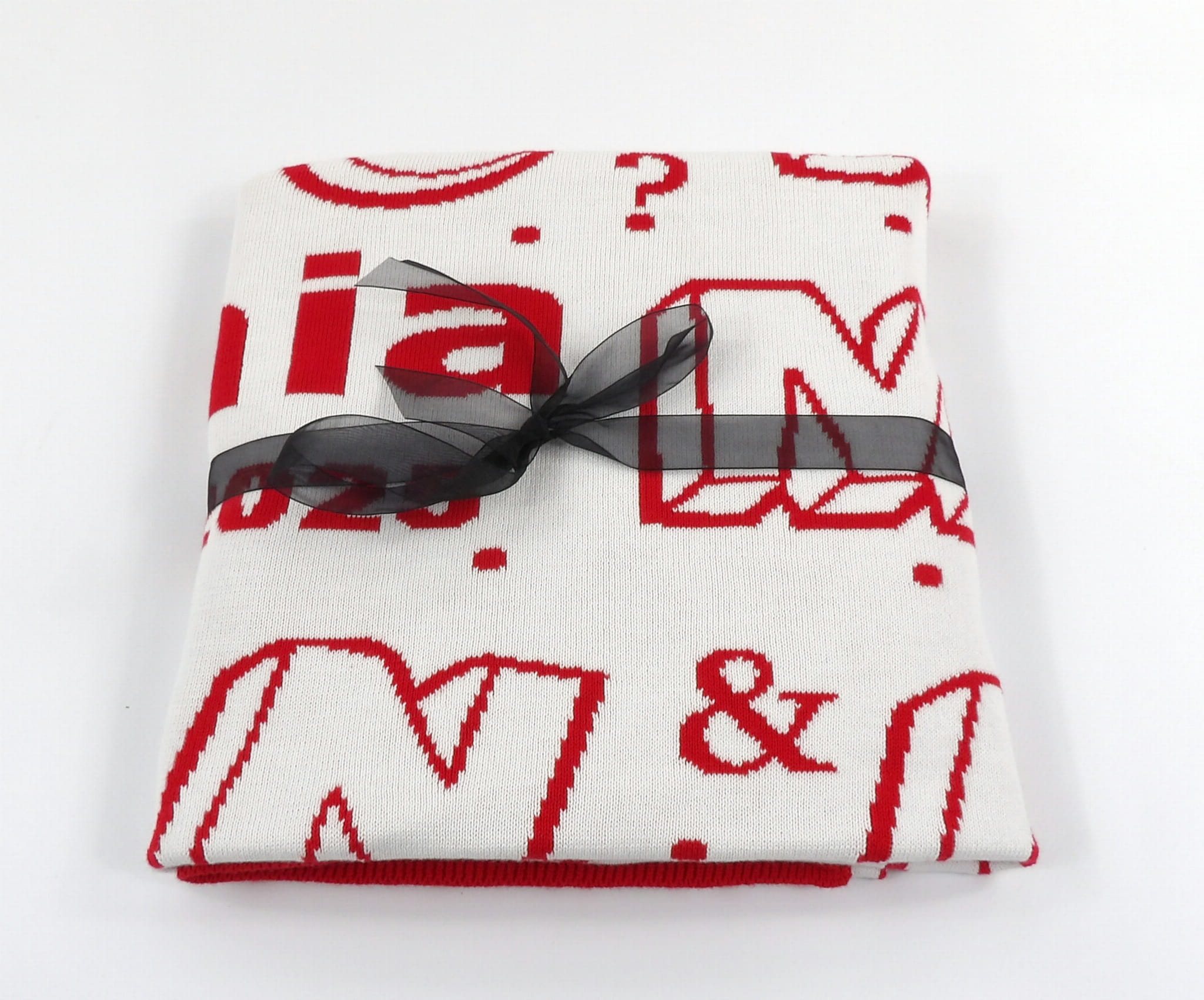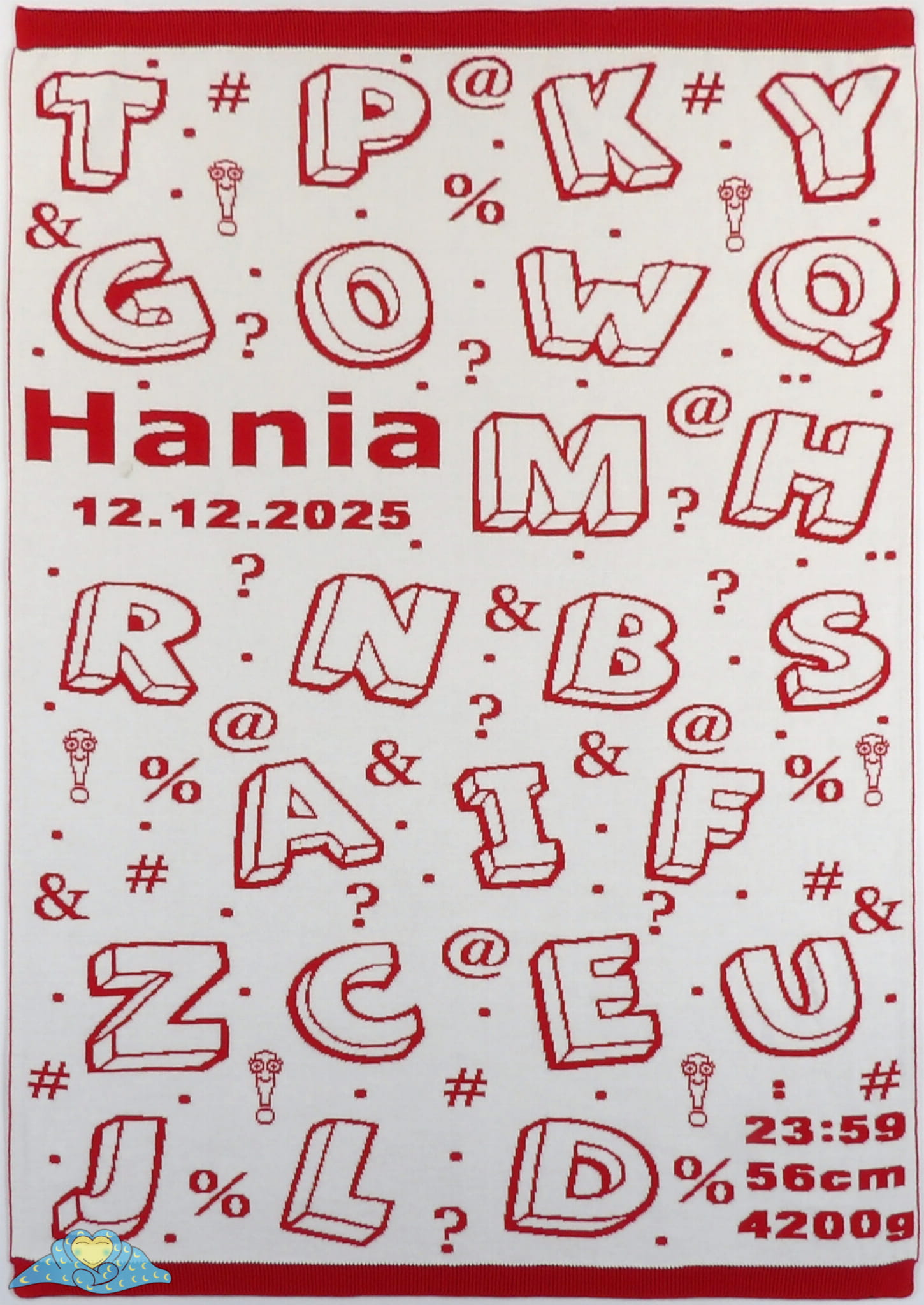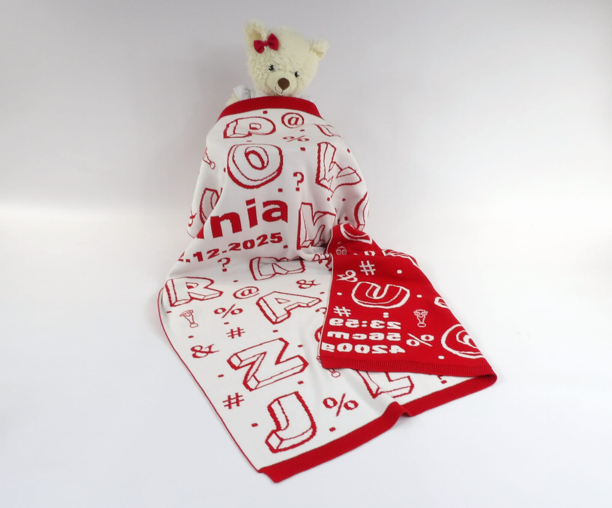 Koc Literki Personalizowany to wyjątkowy kocyk z miękkiej dzianiny żakardowej wykonany ze 100% naturalnej bawełny organicznej.