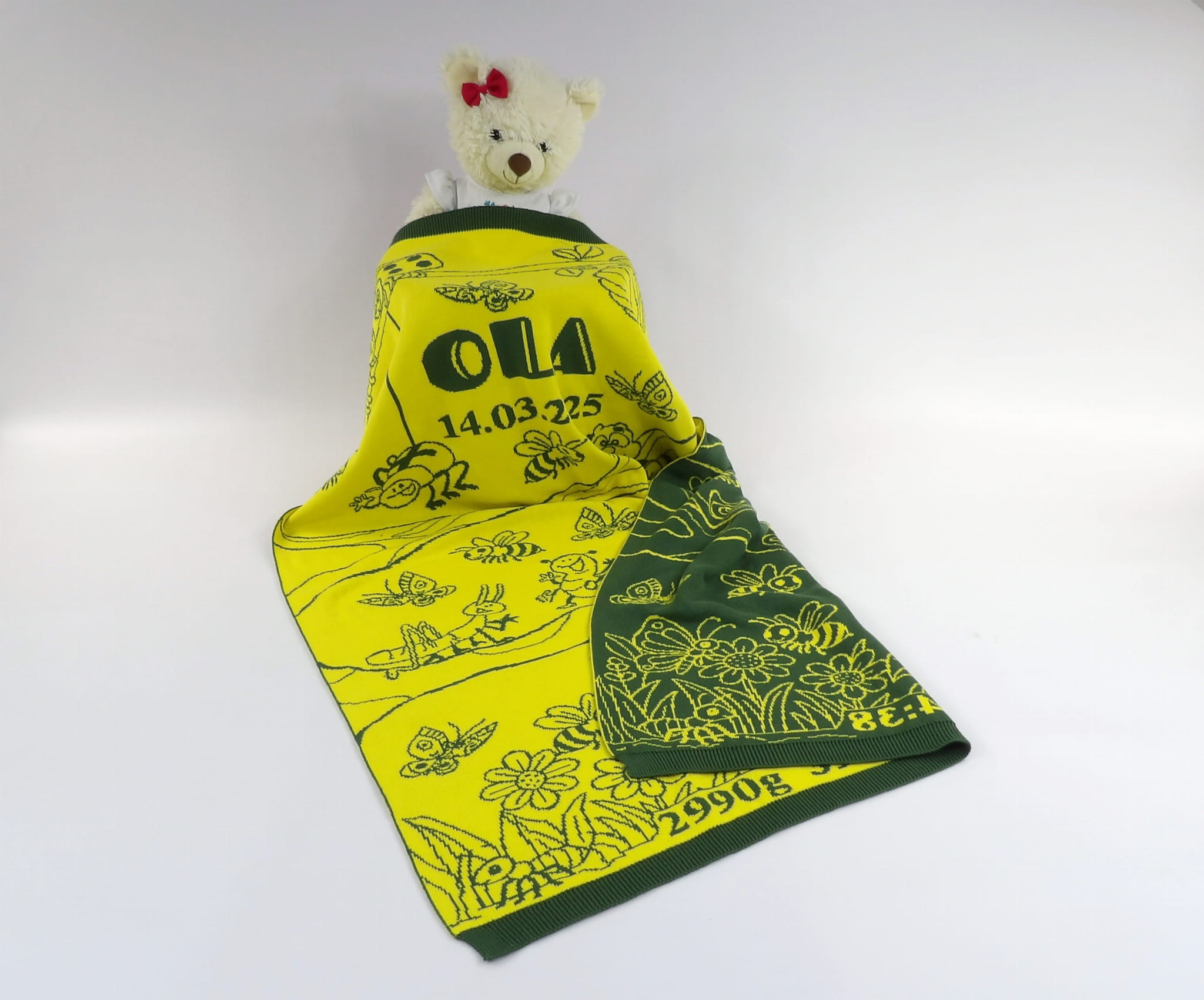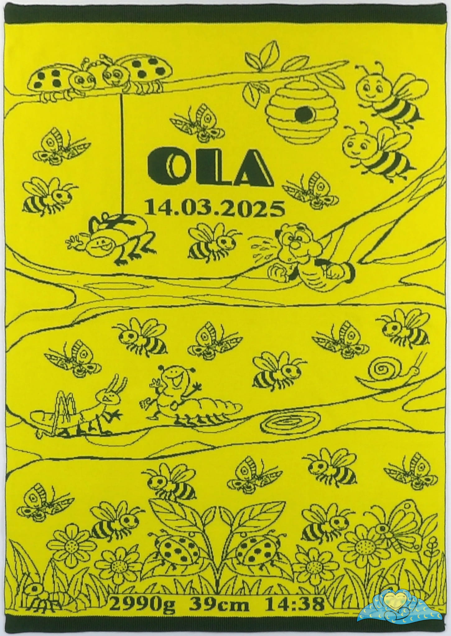 Kocyk z wesołym motywem owadów, z możliwością dodania personalizacji: imienia, daty urodzenia, wzrostu, wagi oraz dowolnej dedykacji.