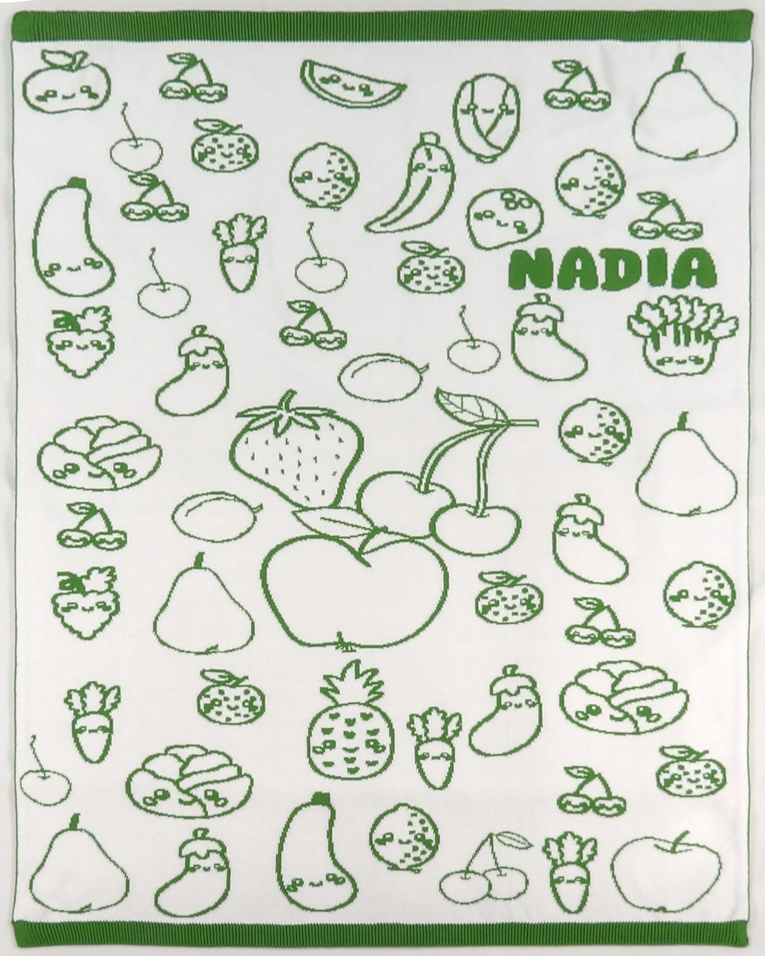 Koc Owoce Personalizowany to wyjątkowy kocyk wykonany z miękkiej dzianiny żakardowej ze 100% naturalnej bawełny.