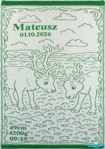 Kocyk z uroczym motywem reniferów, z możliwością dodania personalizacji: imienia, daty urodzenia, wzrostu, wagi oraz dowolnej dedykacji.
