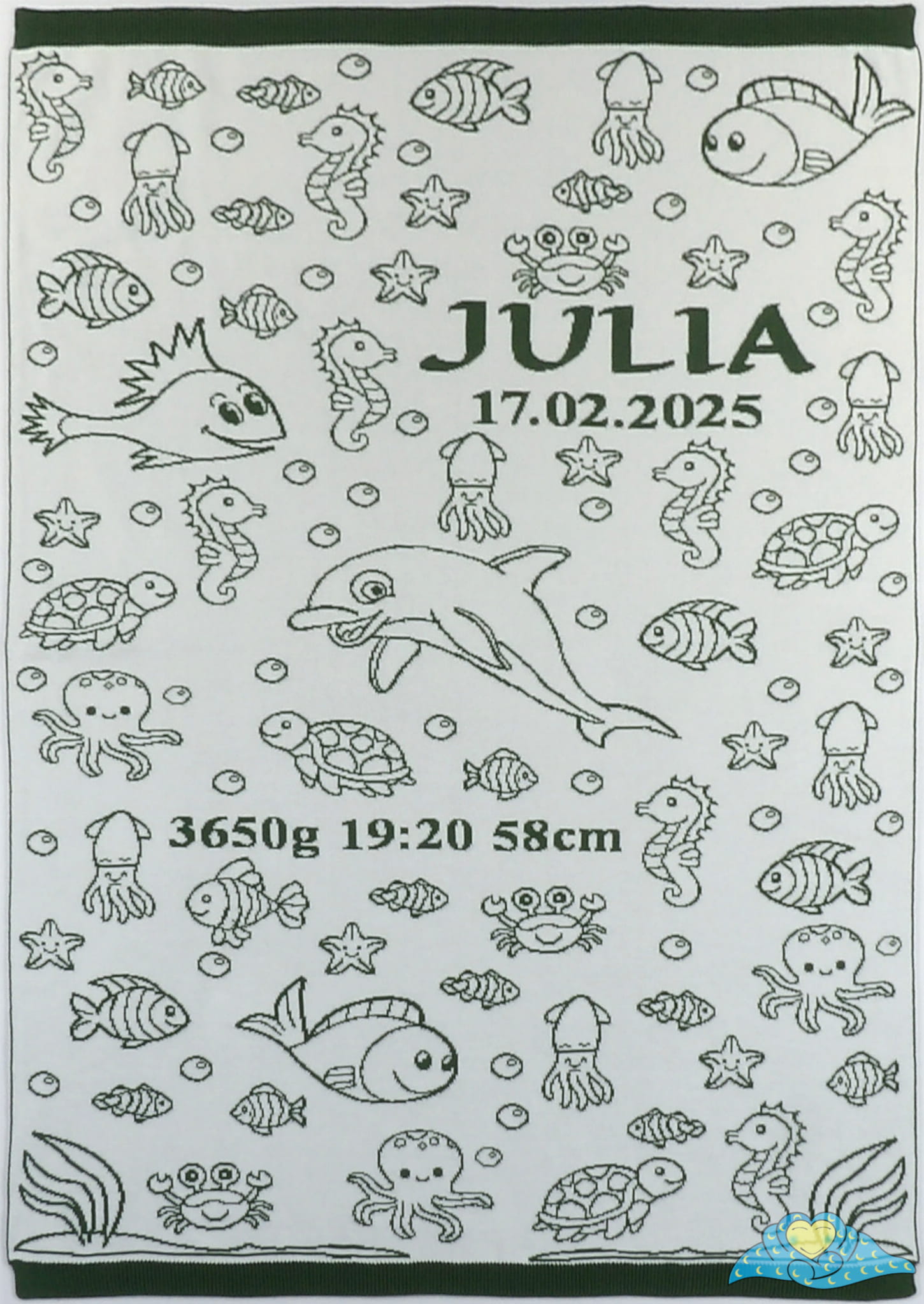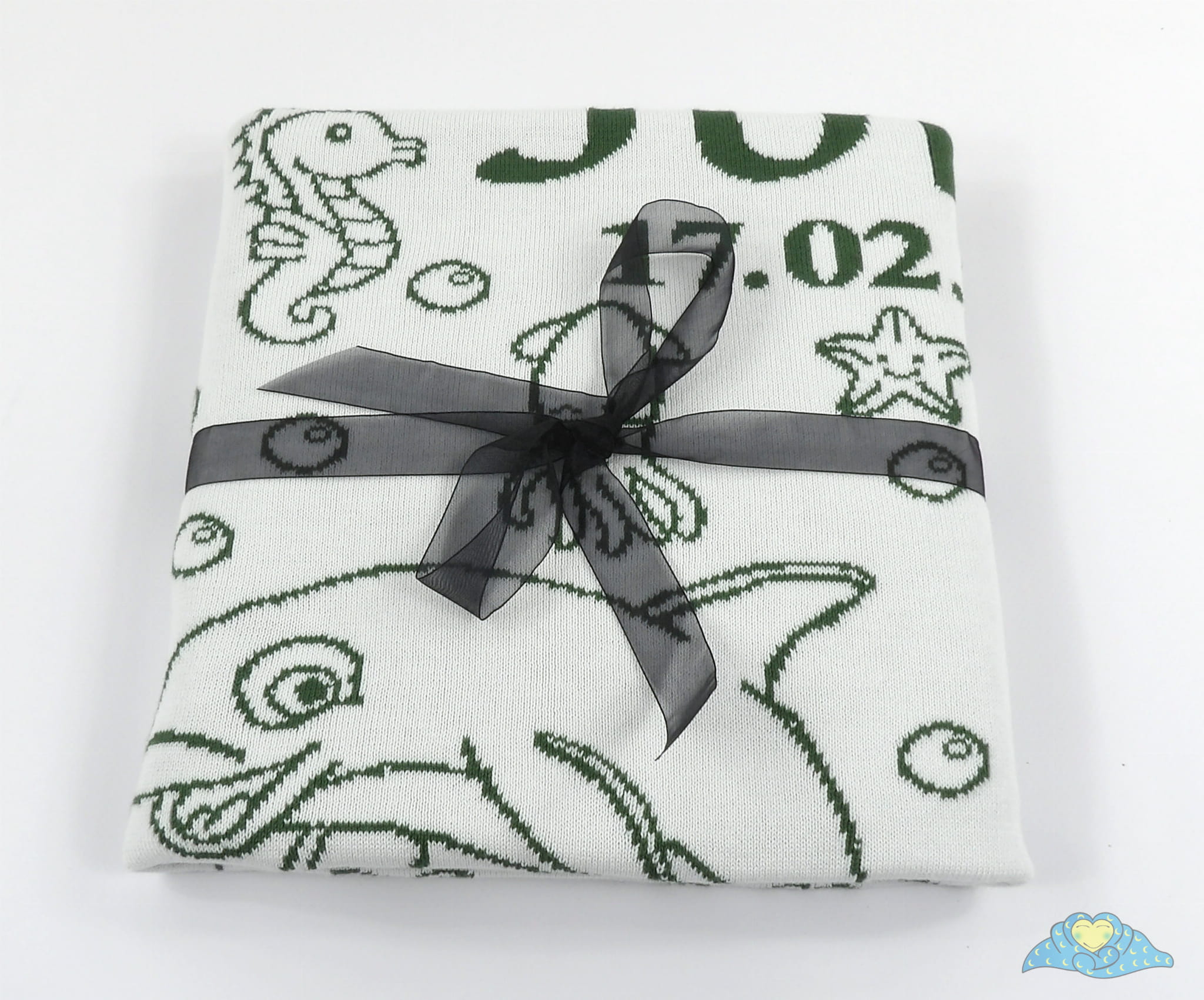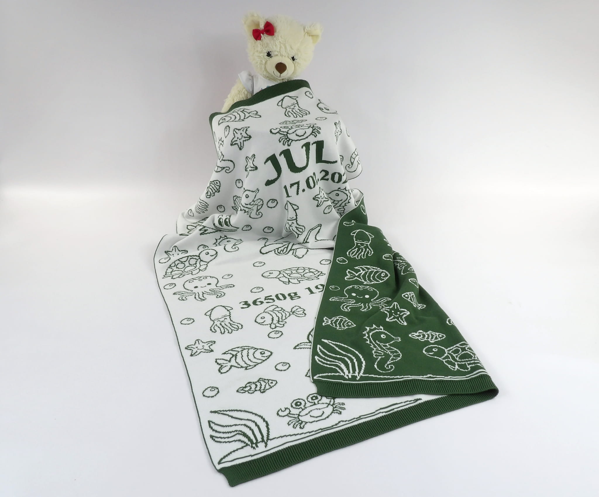Personalizowany, żakardowy (nie jest to nadruk ani haft) Kocyk Rybki z 100% bawełny organicznej.