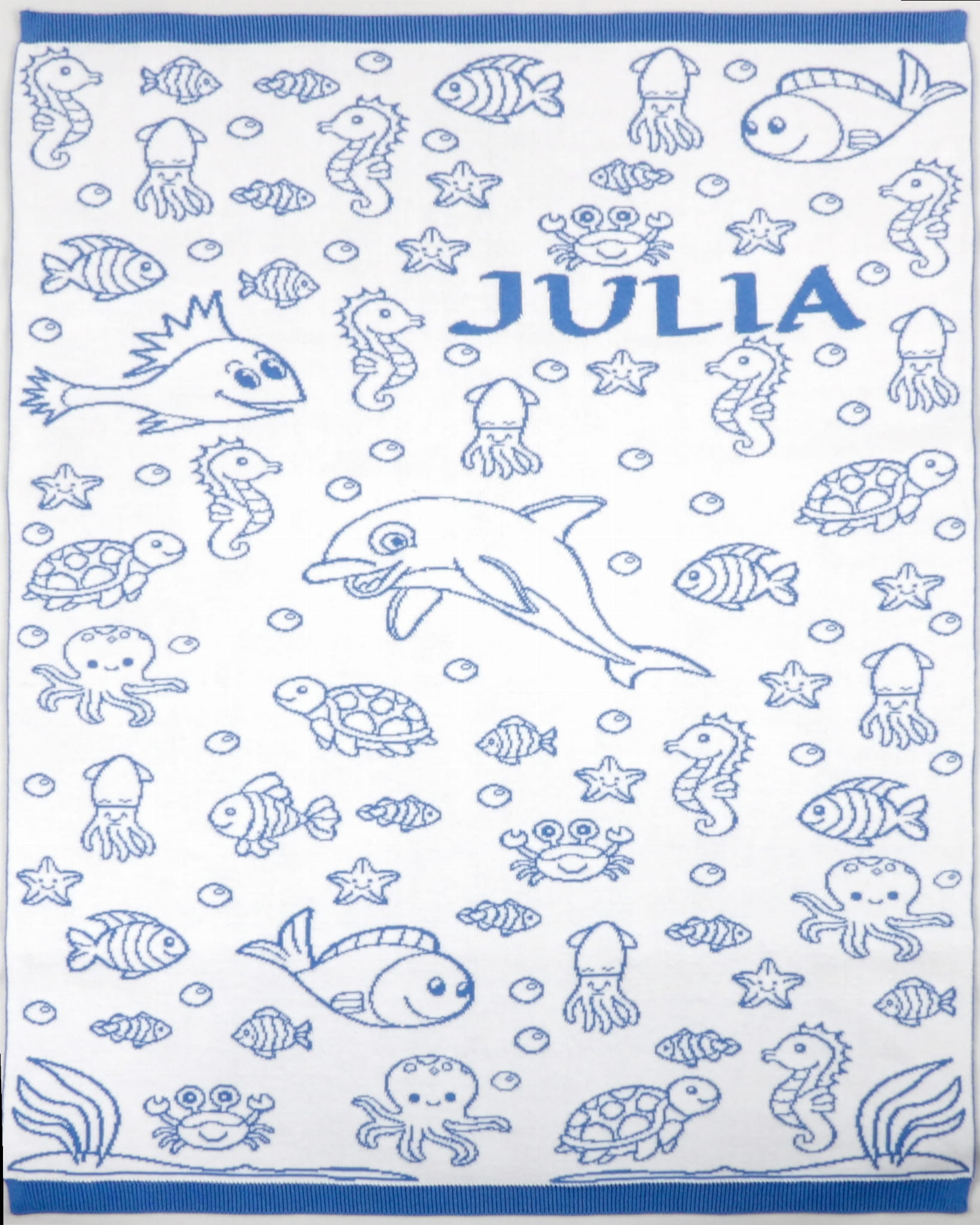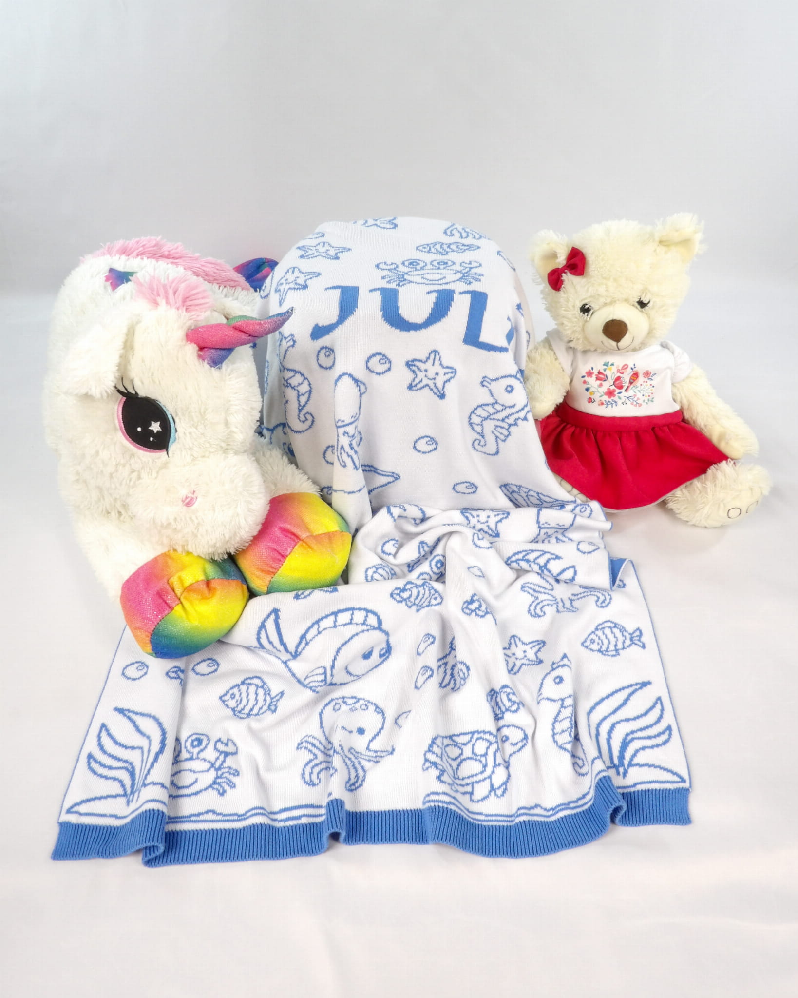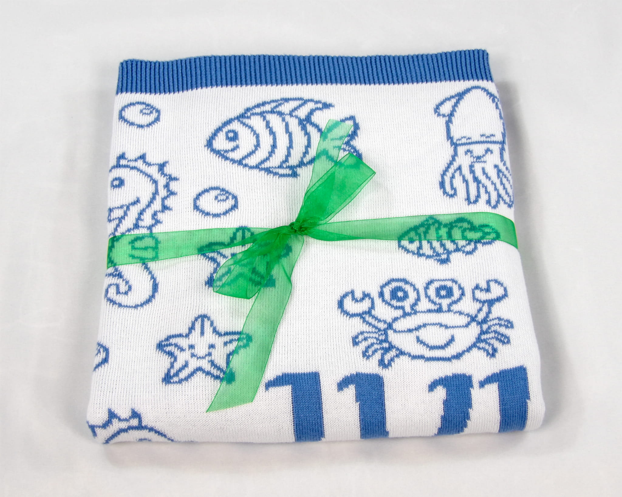 Koc Rybki Personalizowany to wyjątkowy kocyk wykonany z miękkiej dzianiny żakardowej ze 100% naturalnej bawełny.