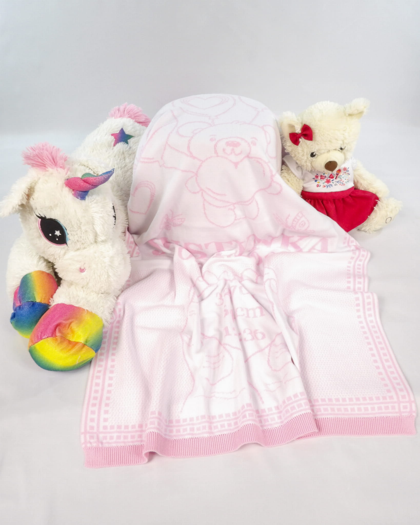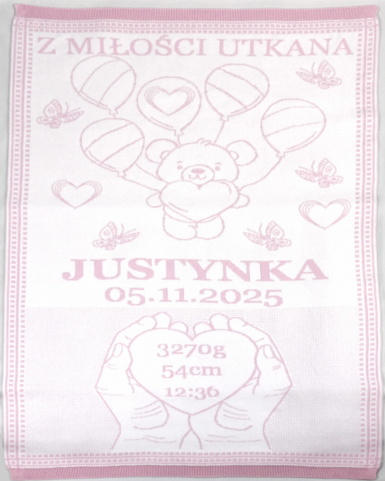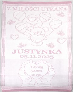 Każdy kocyk możesz spersonalizować, dodając imię dziecka, datę i godzinę urodzenia, wagę, wzrost oraz własną dedykację.