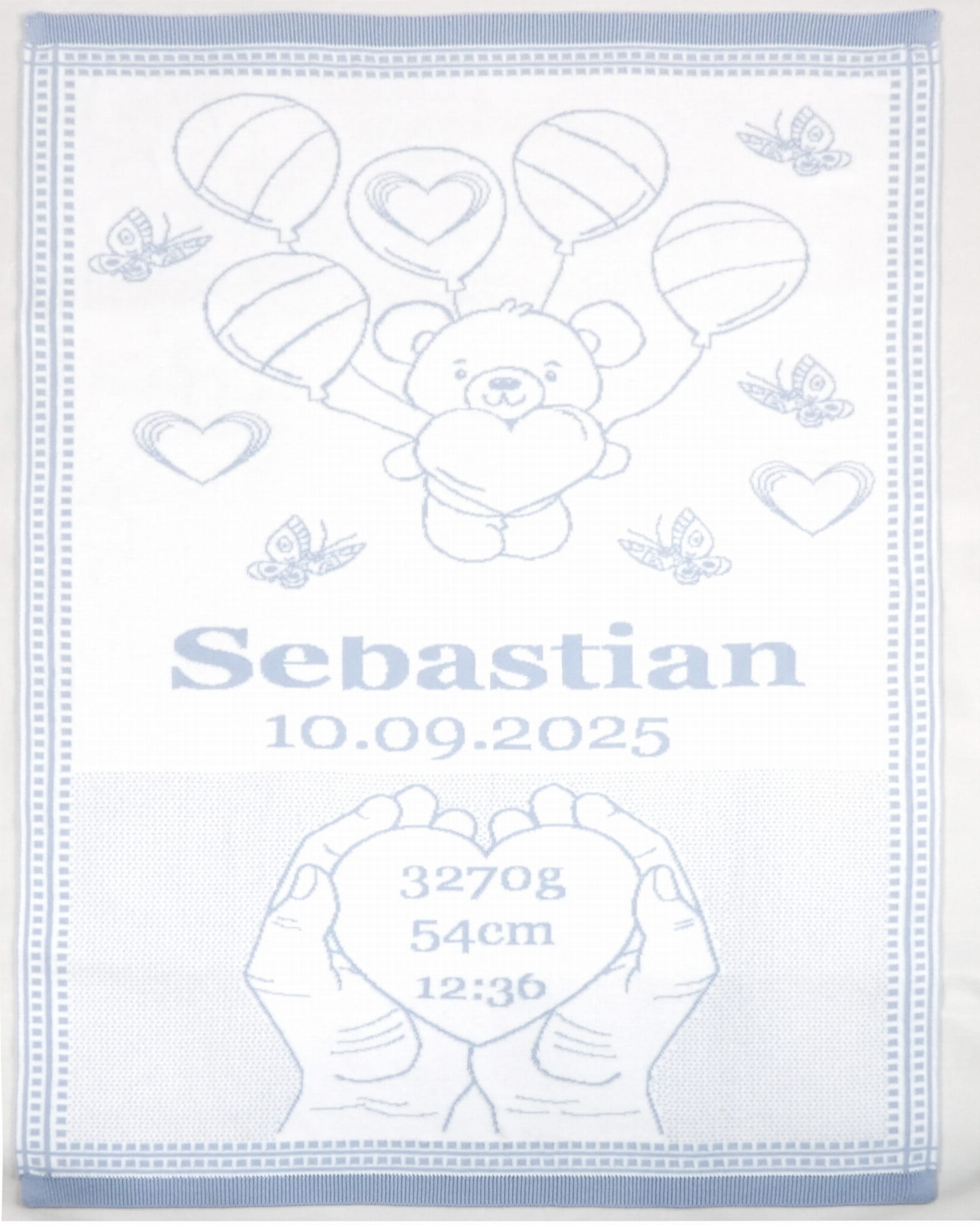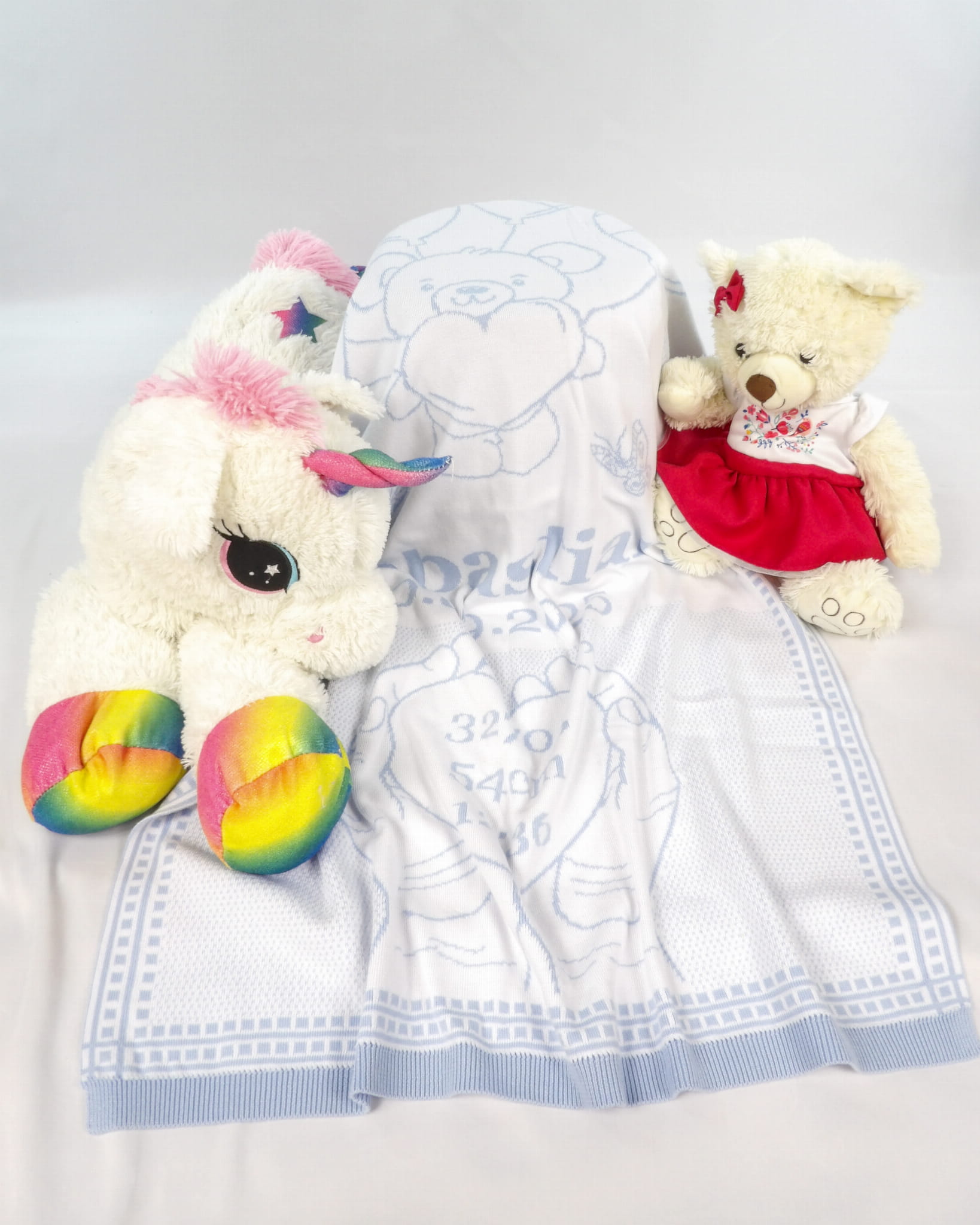Każdy kocyk możesz spersonalizować, dodając imię dziecka, datę i godzinę urodzenia, wagę, wzrost oraz własną dedykację.