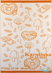 Wesoły wzór inspirowany krainą słodyczy – z lodami, cukierkami i różnymi słodkościami – wprowadza radosny nastrój, z możliwością dodania personalizacji: imienia, daty urodzenia, wzrostu, wagi oraz dowolnej dedykacji.