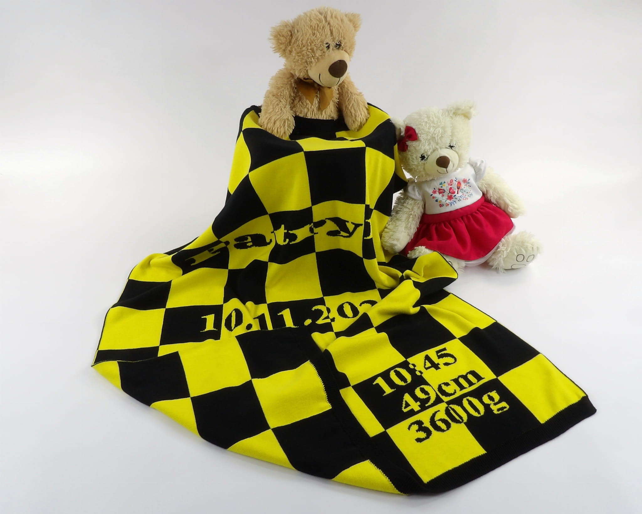 Personalizowany, żakardowy (nie jest to nadruk ani haft) Kocyk Szachownica z 100% bawełny organicznej.