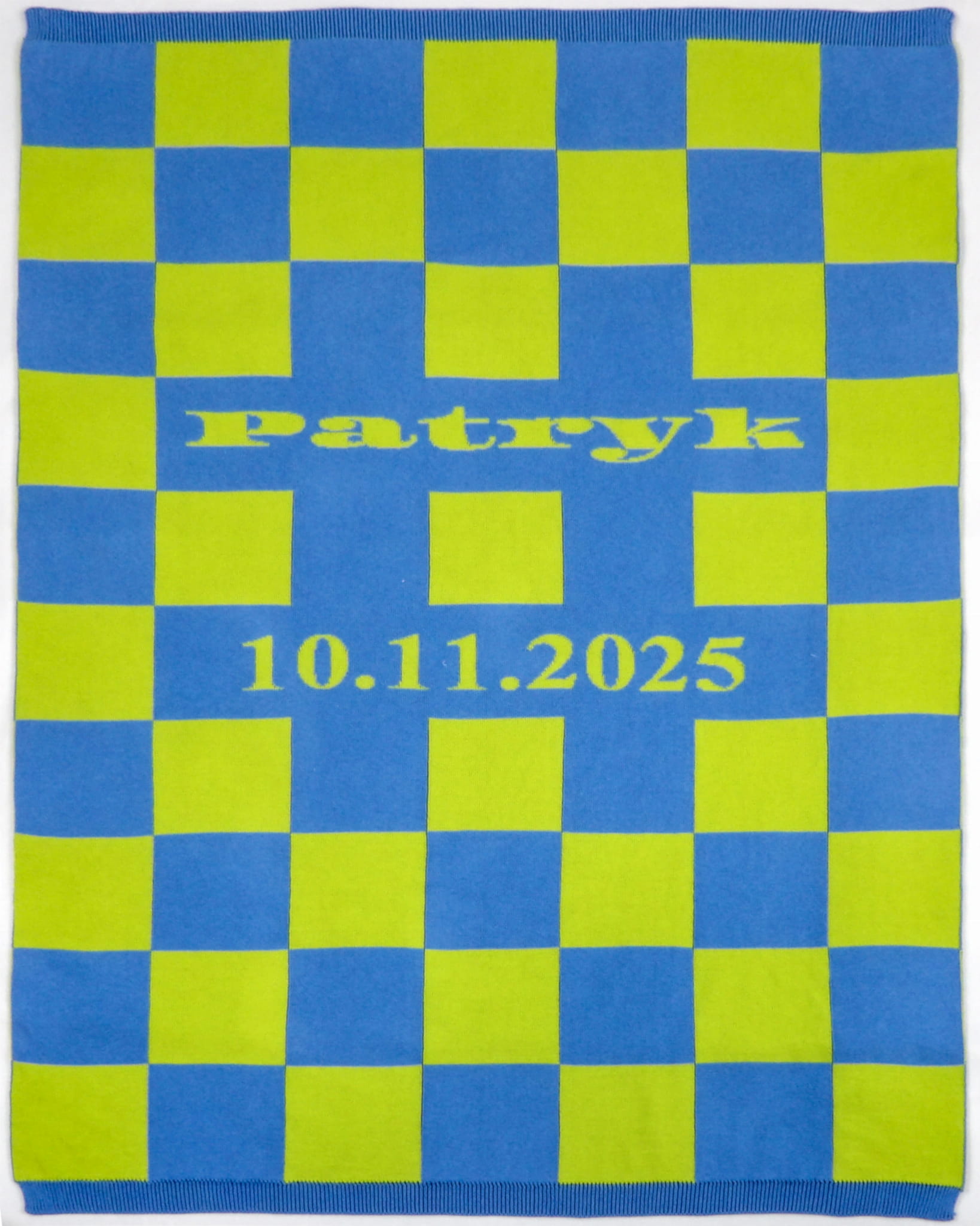 Wzór w geometryczną szachownicę nadaje mu ponadczasowego charakteru, z możliwością dodania personalizacji: imienia, daty urodzenia, wzrostu, wagi oraz dowolnej dedykacji.