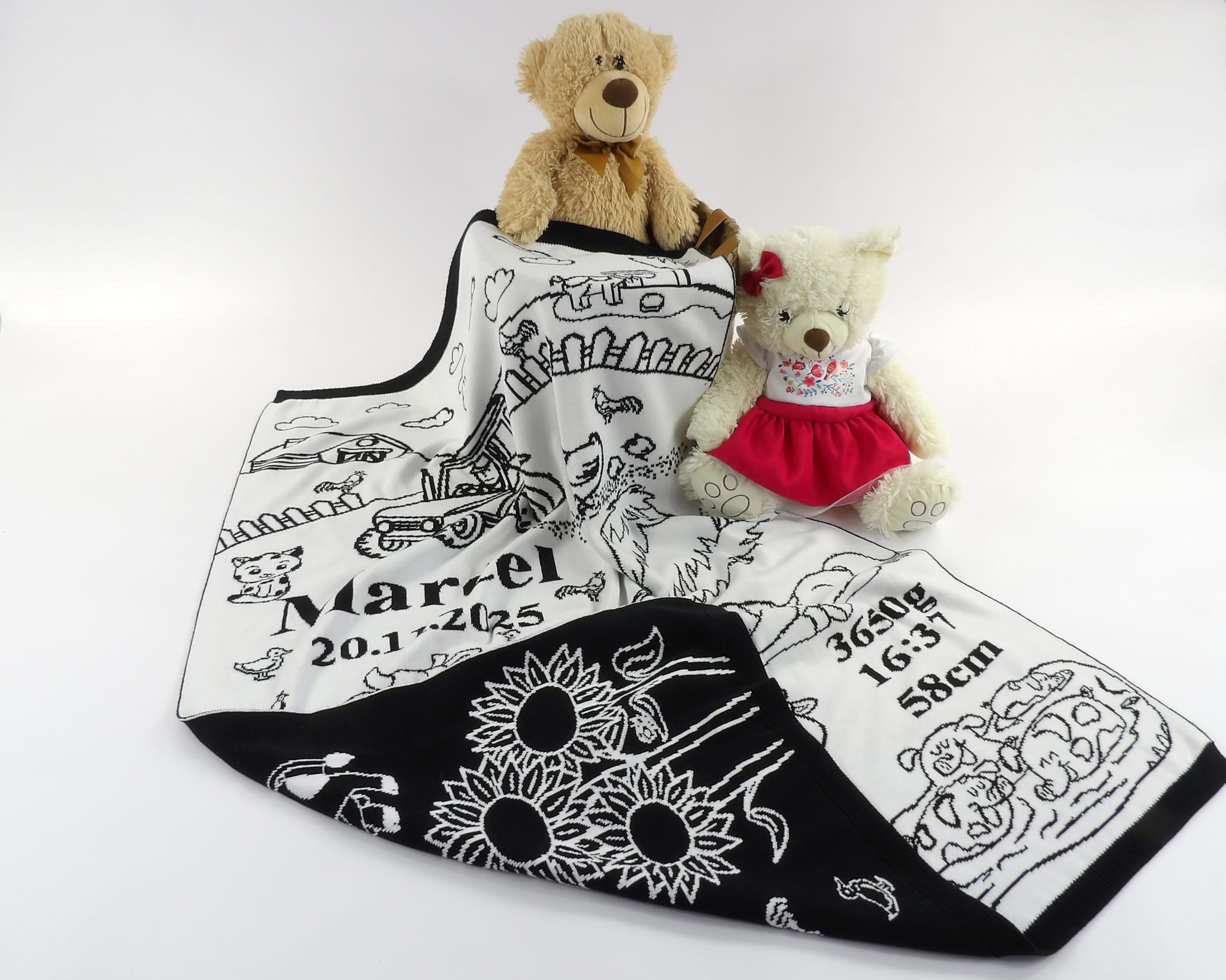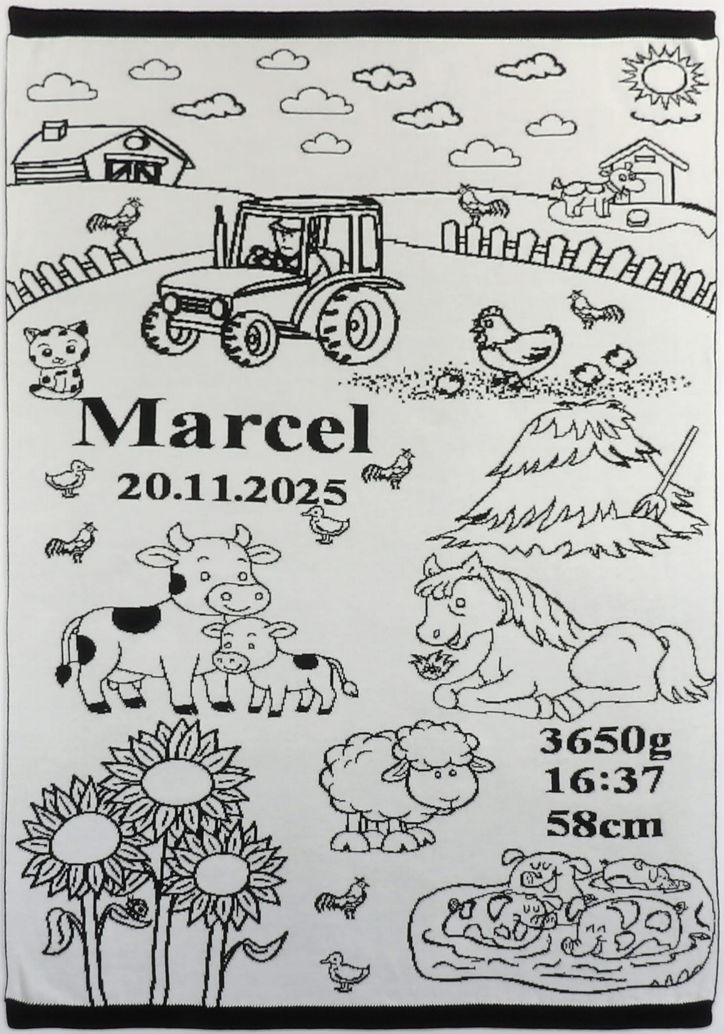Na kocyku znajdują się sympatyczne zwierzątka gospodarskie, domki, pola oraz elementy natury, z możliwością dodania personalizacji: imienia, daty urodzenia, wzrostu, wagi oraz dowolnej dedykacji.