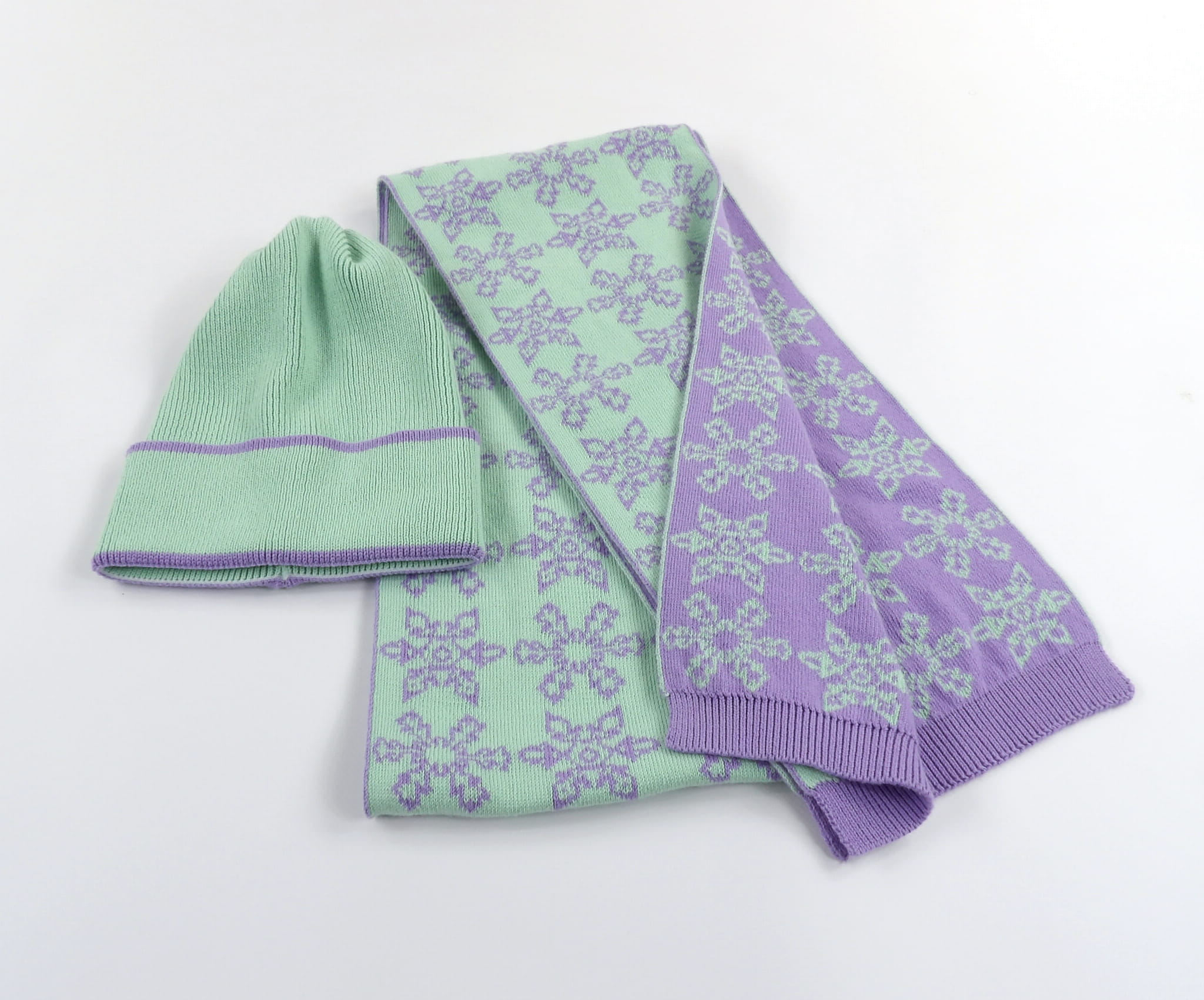 Miękki komlet Czapki z Szalikiem w Śnieżynki z 100% bawełny i certyfikatem OEKO-TEX®.